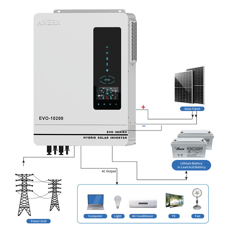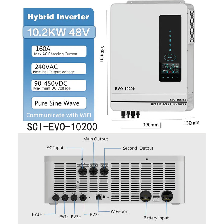 Hybrid Solar Inverter EVO Series 10.2KW là biến tần lai sóng sin tinh khiết, có khả năng hoạt động mà không cần pin, phù hợp cho các hệ thống điện mặt trời độc lập hoặc kết hợp với lưới điện.