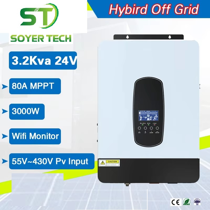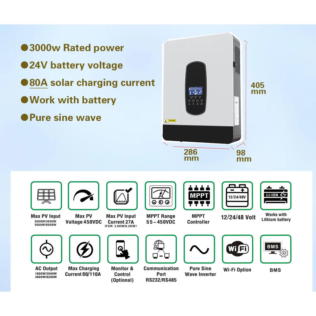 Biến tần sóng sin chuẩn SP-3200VA/3000W 24V là bộ biến tần lai (Hybrid Inverter) tích hợp sạc MPPT 110A, dải điện áp PV rộng (55~450VDC), tương thích pin lithium và hỗ trợ giao tiếp BMS.