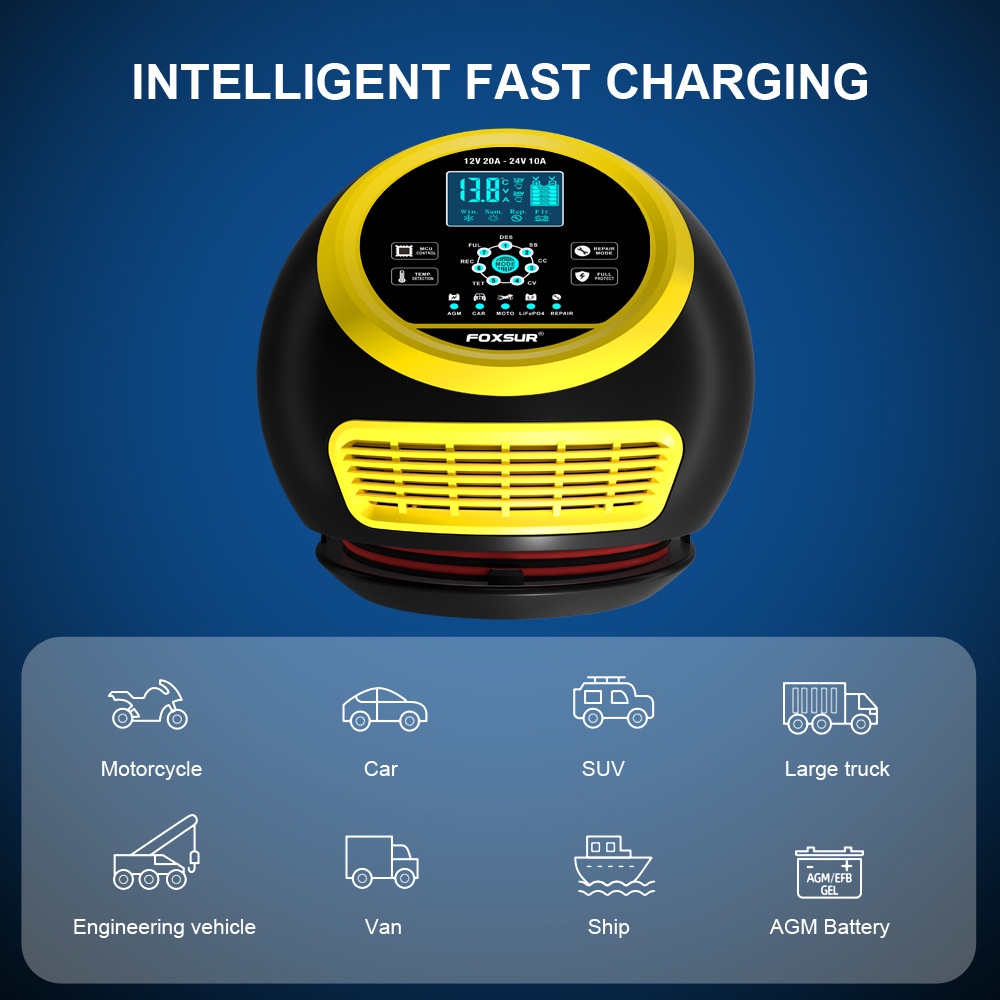Bộ sạc ắc quy đa năng FOXSUR 20A chính hãng với công suất lớn 300W, hỗ trợ điện áp 12V và 24V, thích hợp cho xe ô tô, xe tải và các loại ắc quy axit chì khác. Tích hợp vi xử lý thông minh, công nghệ sạc 7 giai đoạn hiện đại, bảo vệ toàn diện và có khả năng phục hồi ắc quy đã yếu.