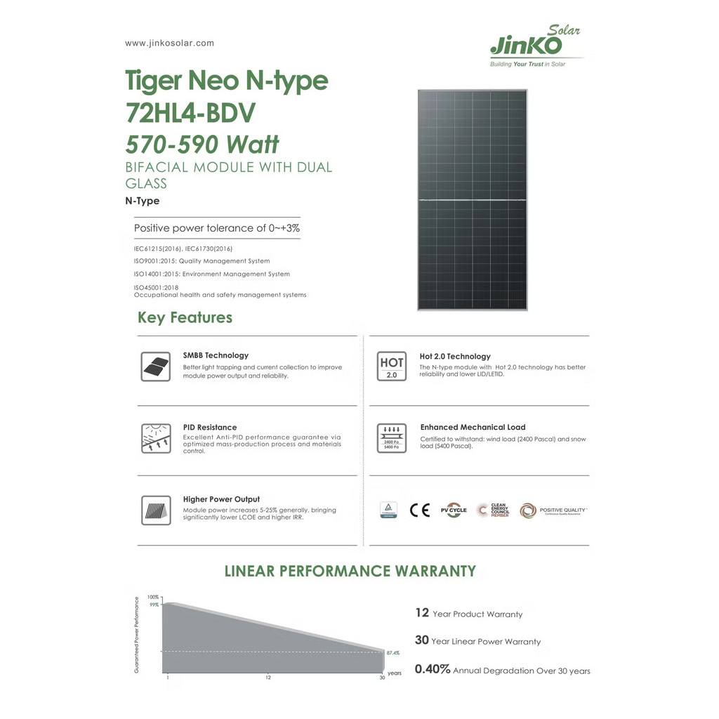 Pin mặt trời JINKO Solar 590W 72HL4-BDV, dòng N-TYPE là dòng công suất cao nhất được sản xuất bởi Tập Đoàn JINKO Solar – nhà cung cấp tấm pin lớn nhất thế giới .