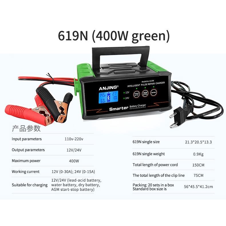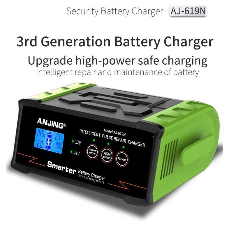 ANJING AJ-619N là bộ sạc ắc quy thông minh thế hệ mới, thiết kế chuyên biệt cho các loại phương tiện từ xe máy, ô tô gia đình cho đến xe tải, xe nâng, xe điện nông nghiệp. Với khả năng sạc cho bình từ 2Ah đến 400Ah, tự động nhận diện điện áp 12V/24V, công suất cao và khả năng phục hồi ắc quy yếu – AJ-619N là lựa chọn toàn diện cho người dùng cần sự an toàn, tiện lợi và bền bỉ.