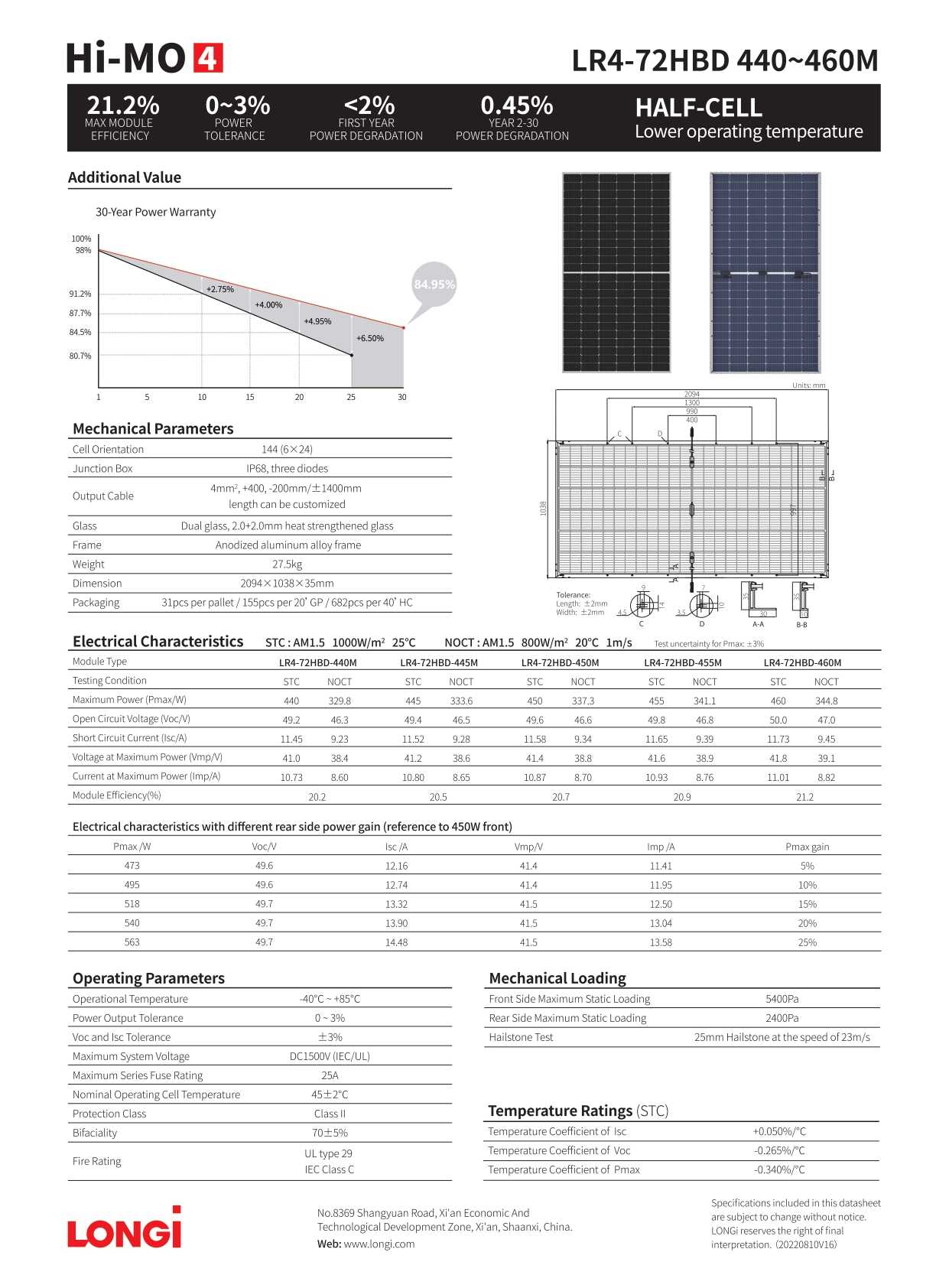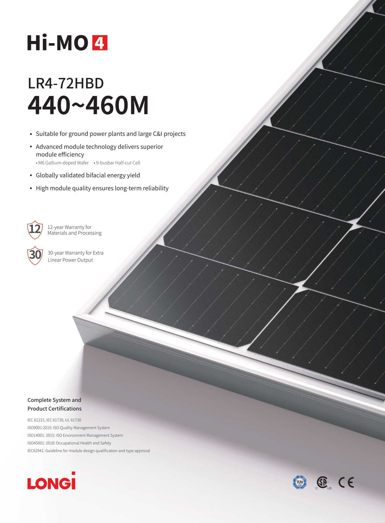 Hồ sơ sản phẩm: Tấm Pin LONGI 440W LOẠI A 2 MẶT KÍNH CAO CẤP LR4-72HBD