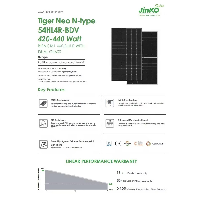 Tấm pin năng lượng mặt trời JinKo 440W là dòng sản phẩm cao cấp đến từ thương hiệu Jinko Solar – một trong những nhà sản xuất pin năng lượng mặt trời hàng đầu thế giới.