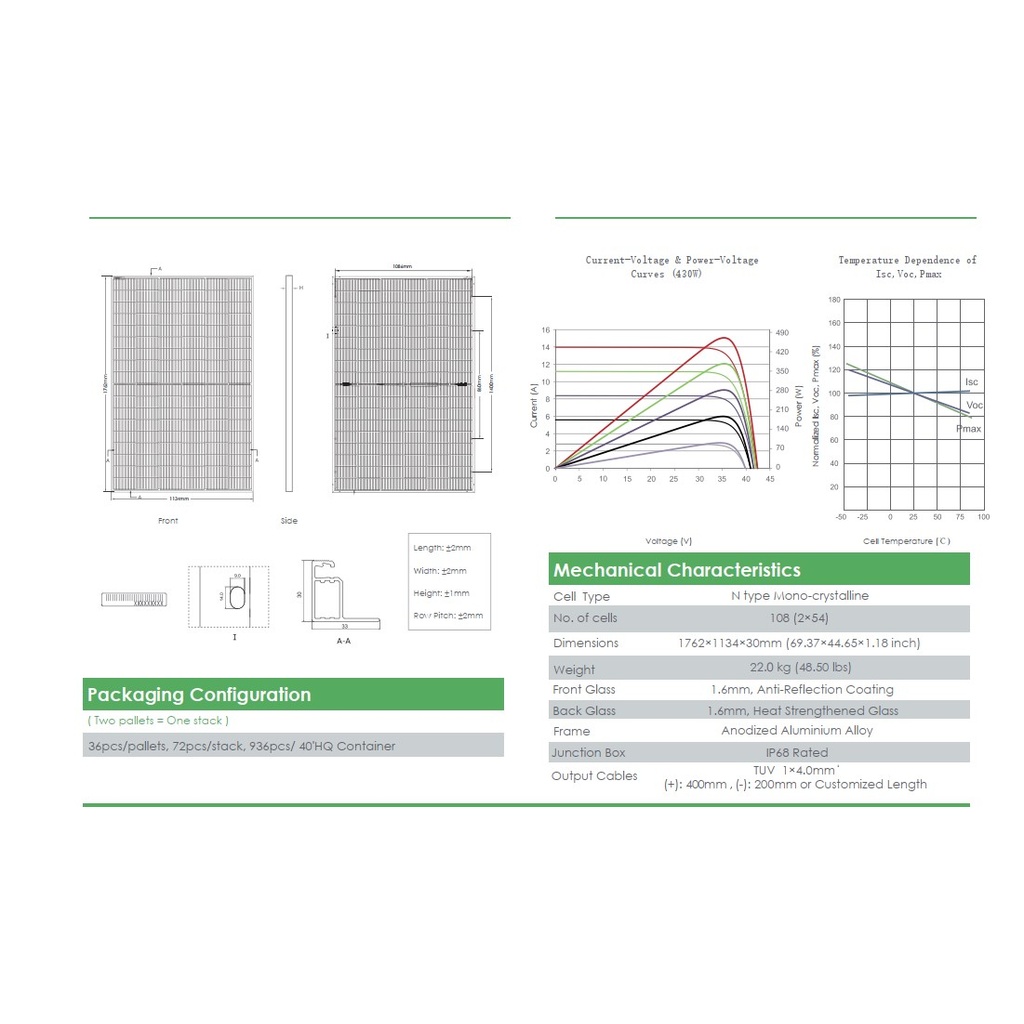 Với công nghệ 2 mặt kính, tấm pin này mang lại hiệu suất cao và độ bền vượt trội, phù hợp cho cả các dự án thương mại và dân dụng.