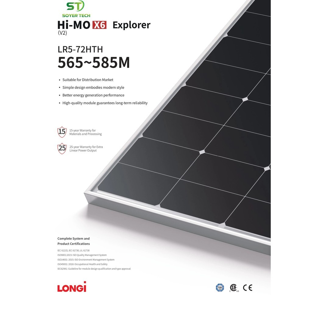 Tấm pin năng lượng mặt trời LONGi 580W LR5-72HTH 580M là sản phẩm thuộc dòng Hi-MO 5 của LONGi, một trong những nhà sản xuất tấm pin năng lượng mặt trời hàng đầu thế giới. Tấm pin này sử dụng công nghệ Mono-crystalline PERC, giúp tăng hiệu suất chuyển đổi quang năng lên đến 22.5%.