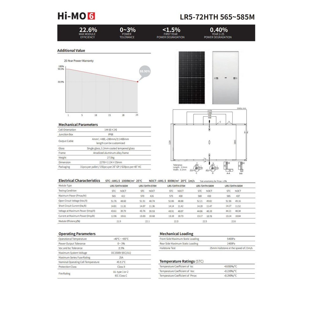 • Bảo hành hiệu suất: 25 năm, đảm bảo hiệu suất trên 89% sau 25 năm sử dụng.